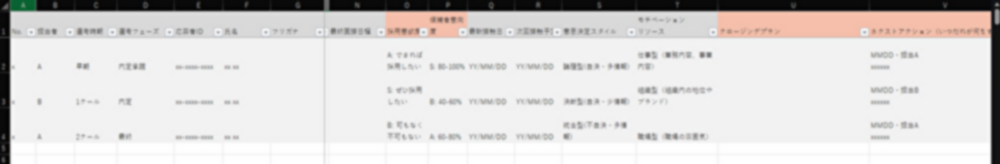 フォロー(内定承諾のための意欲醸成)段階にいる候補者の状況を整理するExcelです。直近の接触時のログや、内定承諾のための作戦などを一覧で管理できます。複数候補者へのチーム内リソース配分の検討に有効です。