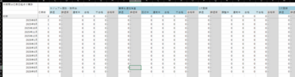 応募のあった候補者の状況を管理するExcelです。応募段階から書類選考、面接を経て内定承諾するまでの一連の流れを一覧で表示することができます。また、月別の歩留まりを可視化できるシートもご用意しています。採用PDCAの改善にご活用ください。