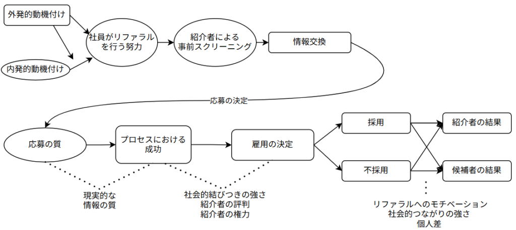 - 事前審査仮説(スクリーニング機能): 紹介した社員による暗黙のスクリーニングが行われています。従業員の81%が「自分が紹介した人が問題を起こしたらどうしよう」という社会的・評判的リスクを懸念していると報告した研究もあり、これが不適切な候補者を事前に排除するフィルターとして機能しています。