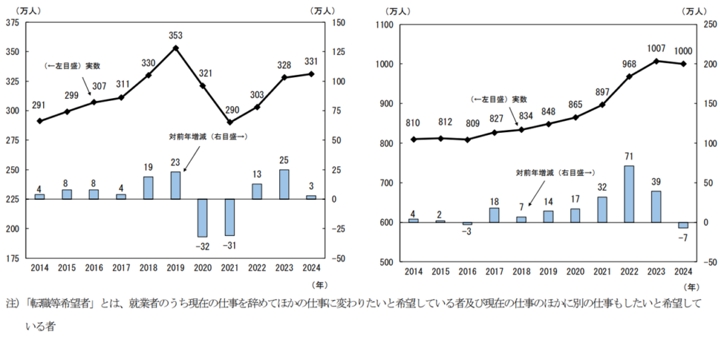 図5、6は2024年までの転職者と転職等希望者の数の推移です。