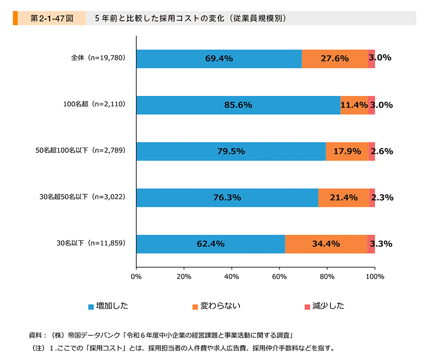 中小企業に調査したデータ (図3) では、直近5年で採用コストが増加したと回答する企業が全体で約7割を占めています (中小企業庁, 2025)。