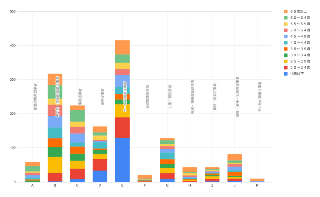 図4は縁故採用を職種年齢別で細分化したものです。サービス職では20代の割合が多くを占めていますが、そのほかの職業では年齢層は分散していることが見て取れます。一方職種別での偏りは大きく、縁故採用はホワイトカラーを中心に行われていることがわかります。