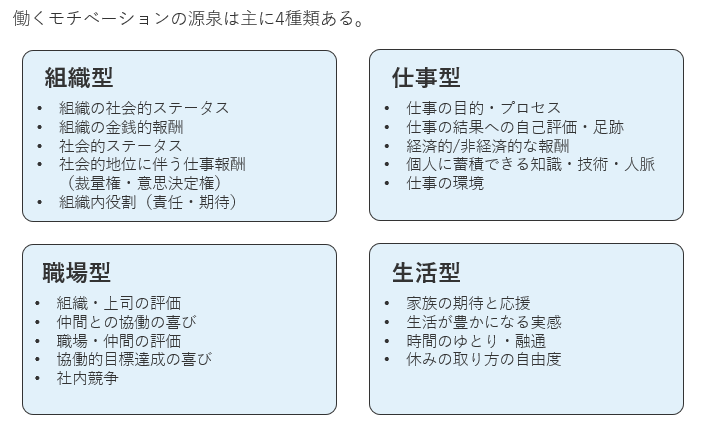 就活状況の把握に加えて、候補者が「意欲を高める要因=モチベーションリソース(やる気の源泉)」も押さえましょう。採用場面で使われる代表的な4分類は「組織型」「仕事型」「職場型」「生活型」です。複数が当てはまることが多いため、どれが相対的に強いかの観点で把握します。見極め方は、 4タイプを提示して自己評価してもらうことと、 過去の経験を振り返り「どのような状況でやる気が高まったか」を質問することで明らかにします。その後タイプ別に刺さる訴求を行いましょう。