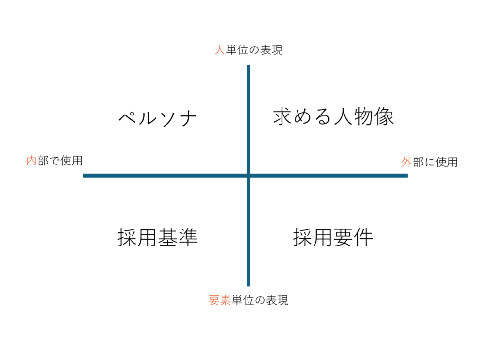 「採用基準」に似た言葉として「採用要件」「求める人物像」「ペルソナ」があり、混在して使われがちです。これらの4つの違いを整理し、前提を揃えるところから始めます。